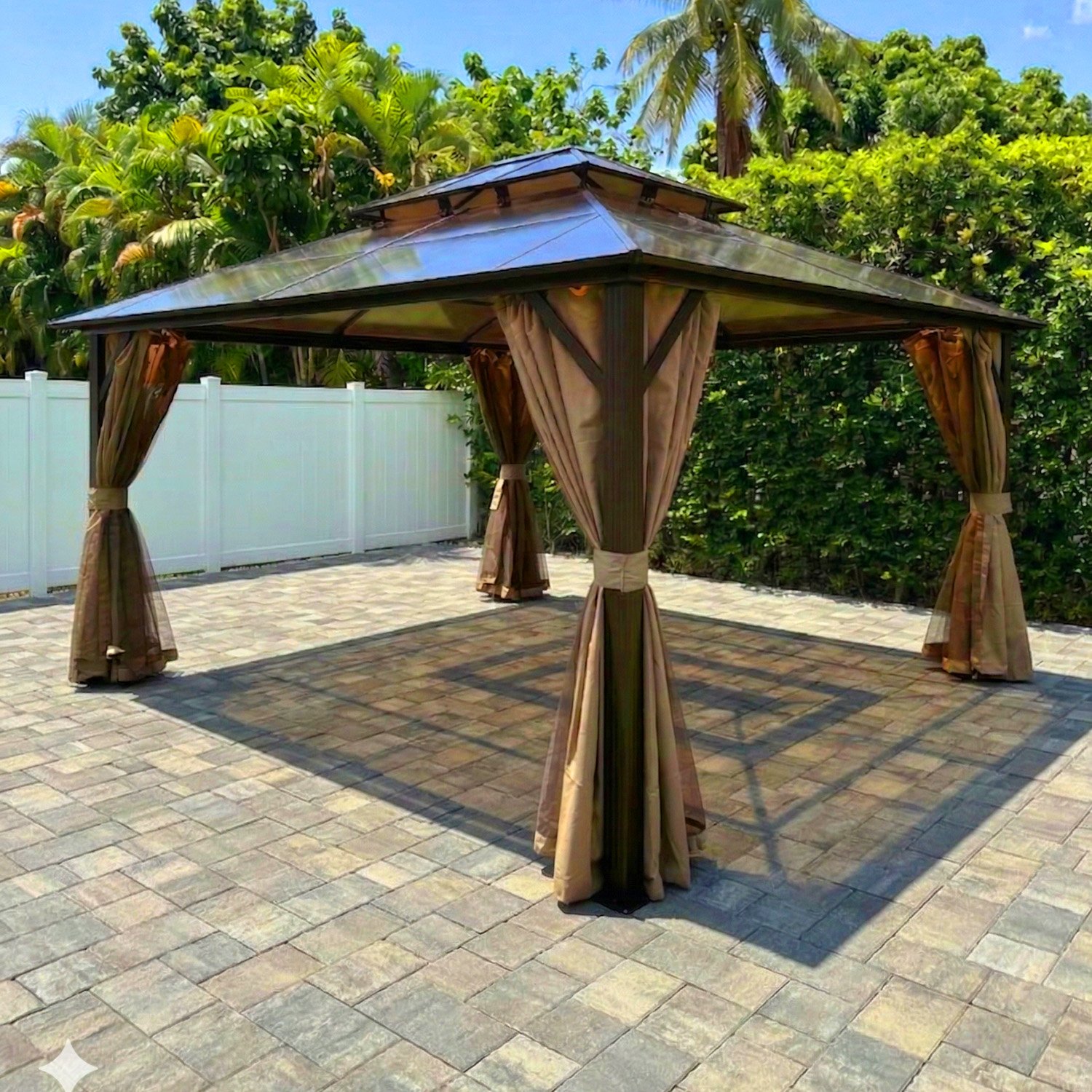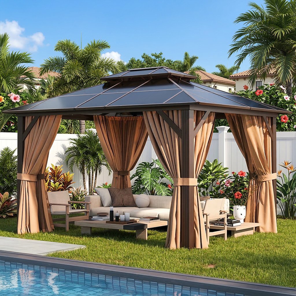 This <strong>10×12 Double Roof Gazebo</strong> features durable polycarbonate panels that allow natural light while protecting from UV rays.