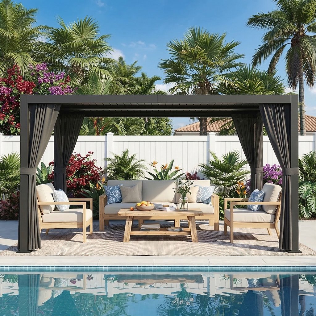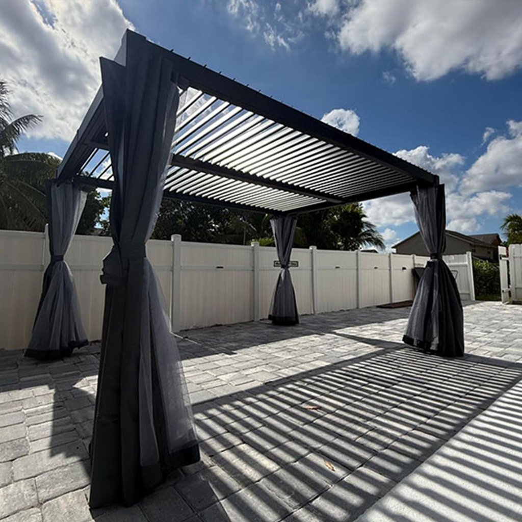 Open the louvers for natural light or fully close them for shade and rain protection. Its sleek black finish makes it a perfect addition to modern patios and outdoor living spaces.